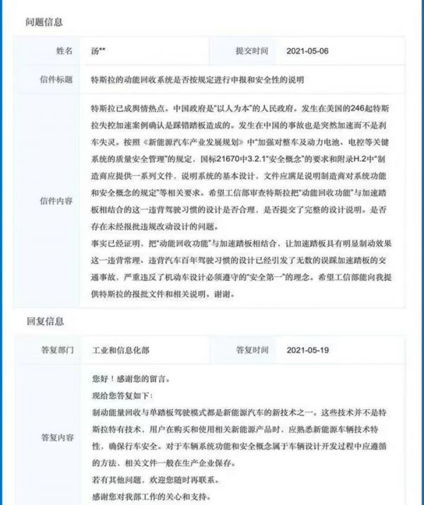 有网友在工信部网站上提问,特斯拉在中国发生的事故经调查均是“突然加速”而非“刹车失灵”,希望工信部审查特斯拉把“动能回收功能”与加速踏板相结合的这一违背驾驶习惯的设计是否合理,是否提交了完整的设计说明。