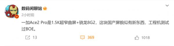 今日,据博主数码闲聊站带来的爆料称,一加将会为一加Ace2带来Pro版本新品,也就是一加Ace2 Pro,搭载的处理器为骁龙8Gen2,屏幕为一块国产的1.5分辨率超窄边框双曲面屏幕,而且该博主还表示这块屏幕是有点东西的,工程机状态的时候测试过京东方的屏幕。