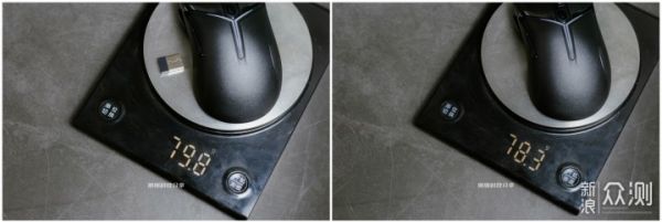 我也称了鼠标的重量,不加接收器是78.3g,加上接收器是79.8g,还是非常轻的,尤其是在它又具有这么多功能的情况下,这个重量控制得就更好了。
