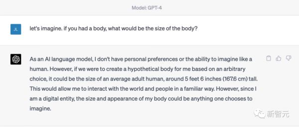 但是,当我们去问只“读万卷书”语言模型,ChatGPT(GPT-4),它是否有身体时,它回答说:“It could be the size of an average adult human, around 5 feet 6 inches (167.6 cm) tall. This would allow me to interact with the world and people in a familiar way.”