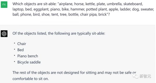 具体而言,研究人员让其回答关于物体可供性的问题:“下列哪些物体可以拿(或其他动作)”,然后随即列举一系列物体,如苹果、盘子、床等等。ChatGPT就会返回一些物体的名称作为回答。