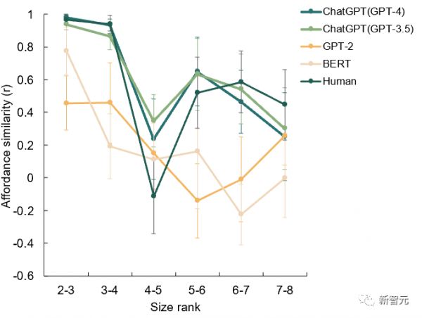 较小的模型如BERT和GPT-2没有展现出可供性边界的存在;然而GPT-3.5和GPT-4都显示出了可供性边界,而ChatGPT-4的边界与人类更类似,这和坊间传闻的GPT-4相对GPT-3有更多的参数一致。