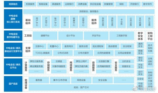 顺势而为,中电金信与腾讯云共同打造联合核心方案,旨在解决银行核心重构的最后一公里的落地难题。联合核心方案以中电金信“源擎”云原生分布式核心业务系统构建,基于中国电子金融级数字底座“源启”,结合腾讯云基础设施,支持云原生和单元化,面向银行机构实现全栈国产化落地,具备高性能、高可用、高安全和可动态弹性扩展能力,为金融用户提供关键的核心业务处理能力。
