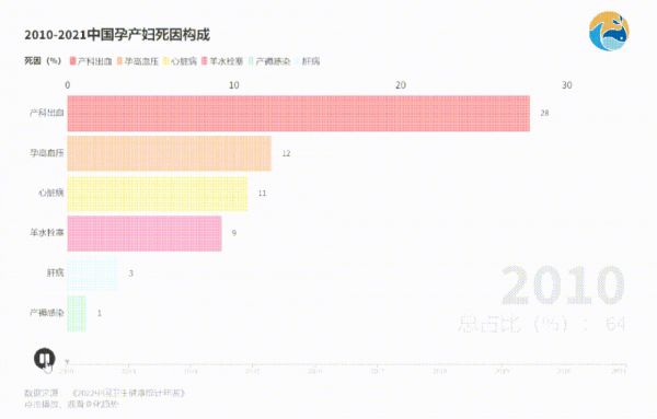 在所有死亡病例中,产科出血是孕产妇死亡的最主要原因,在孕产妇死亡总数中占比超过20%。妊娠期高血压、心脏病、羊水栓塞各占死亡总数10%左右,其次是产褥感染和肝病。