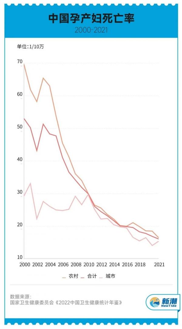 从2000-2021年,中国孕产妇死亡率从每10万人中有53人死亡,下降至每10万人中有16人死亡。2000年,农村孕产妇死亡率是城市的两倍多,但2010年后,农村孕产妇死亡率基本和城市持平。