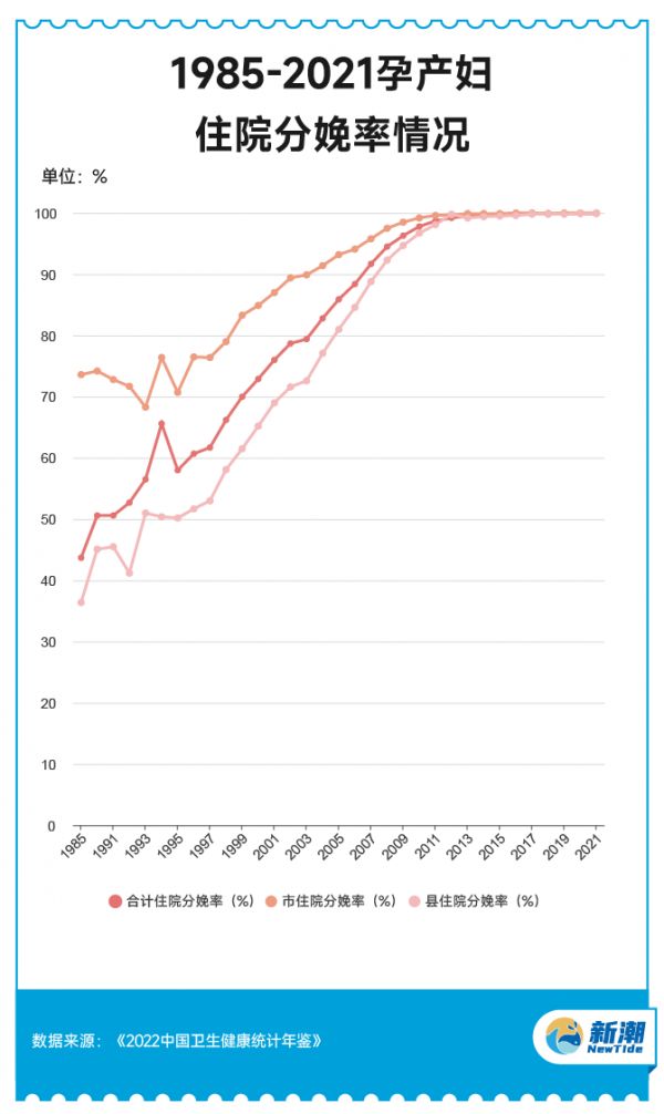我国孕产妇死亡率的大幅降低,得益于孕产妇保健不断完善。1995年以来,孕产妇住院分娩率大幅度上升,2010年后孕产妇住院分娩率稳定在99%以上。孕产妇保健达到较高水平,系统管理率、产前检查率、产后访视率也达到了90%以上。