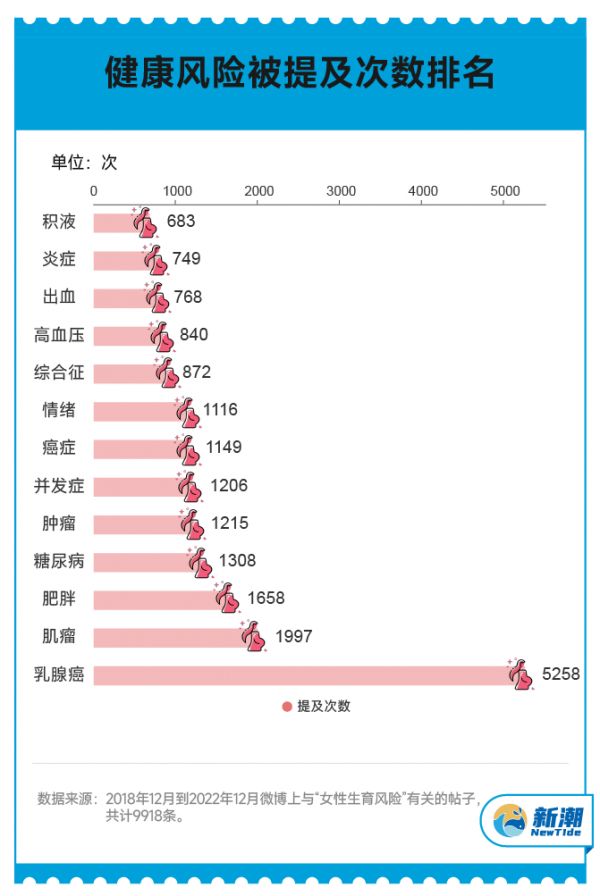 我们从微博上爬取了2018年12月到2022年12月与“女性生育风险”有关的帖子,共计9918条,进行词频分析后发现,对于具体的生育风险因素,“乳腺癌”的讨论度最高。患有乳腺癌的女性能否生育、如何生育和过来人的经历受到高度关注。糖尿病、高血压、出血作为常见妊娠并发症和分娩现象,也被高频提及。