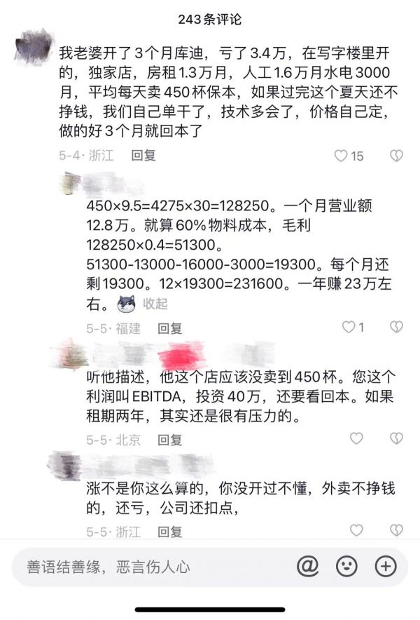 一位网友在抖音爆料,自己老婆开了3个月库迪,亏了三四万块钱。因为每个月高昂的运营成本,加上还有库迪的扣点,每天需要保证卖450杯才保本。