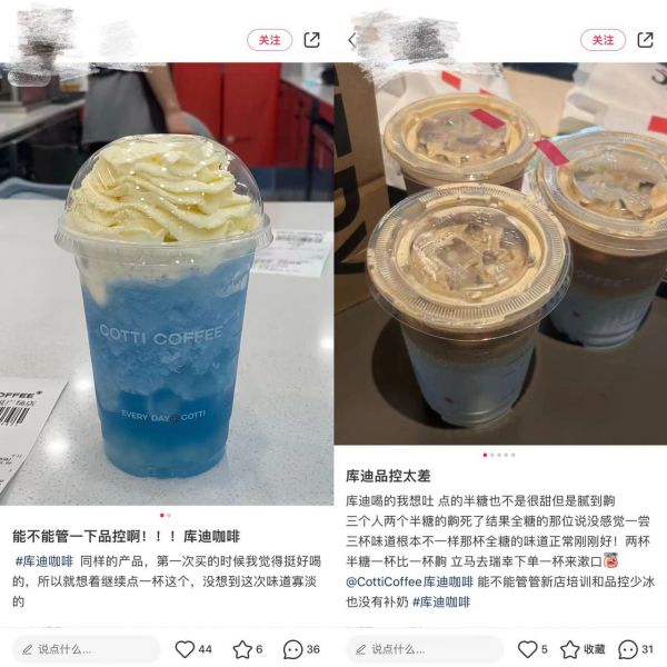 这点上,小红书里对库迪品控的吐槽贴并不鲜见。比如,点了同样一杯潘帕斯蓝椰库可冰,两次味道完全不一样;半糖比全糖的还要甜......