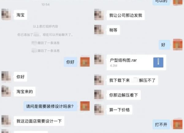 近日,从事装修行业的萌萌(化名)反馈,她经常会遇上客户加微信后带着户型图来询价的情况。5月初,有客户通过某二手闲置平台找到其店铺咨询装修事宜,两人加过微信后,对方随即发来一个压缩文件,称是户型图让萌萌查看报价。