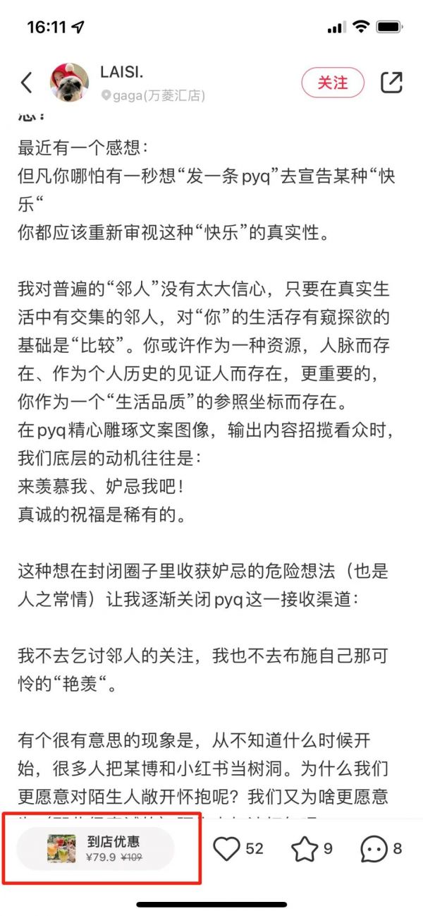 同时也正在试运营团购功能,用户可以直接在笔记右下角,购买本地餐饮团购套餐,然后到店消费。