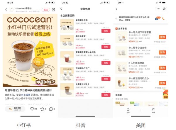 拿椰子水cococean来说,cococean抖音团购可选项最多,既有9.9元椰子脆低价引流产品,也有单颗椰子冻这样的爆品。