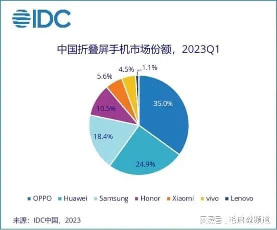 (IDC)发布最新数据显示,2023年第一季度,中国智能手机市场出货量约6544万台,同比下降11.8%。2023年开年依然持续低迷,2022年以来每季度出货量同比下降幅度超10%。OPPO、苹果、vivo、荣耀、小米位居前五,三星仍然在“其它”行列。可怕的是,但是中国折叠屏产品出货量保持稳定,出货量达到102万台,同比增长52.8%。其中竖折产品份额继续上升至44.3%。三星的折叠屏蛋糕不断被国产手机蚕食。