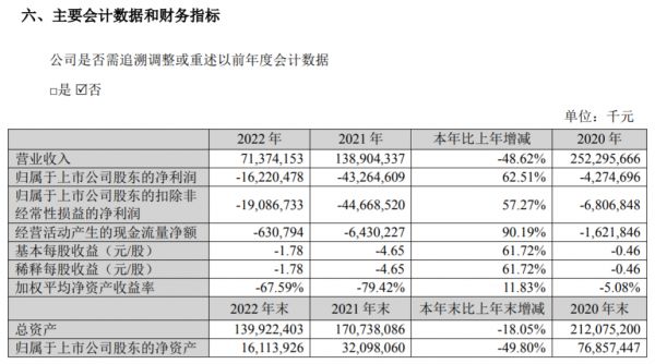 结果直接体现在财报上,自2020年起,苏宁易购由盈转亏。2020年至2022年,苏宁易购的营业收入分别为2523亿元、1389亿元、713.7亿元,同期净亏损分别为42.75亿元、432.6亿元、162.2亿元,过去三年累计亏损高达637.55亿元。