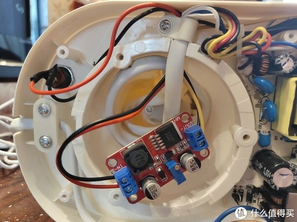 根据风扇功率20w,tb翻了很久dd下单一个xl6019方案的升压板子,能稳定输出24v1a,包邮6块。然后找了个废电脑电源拆了导线,还有一个库存的5.5*2.5的母头,再在风扇上开了个洞,风扇内的改造就完了。成型就是增加一个12v5.5*2.5的圆形输入口。