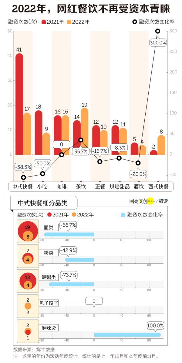 根据烯牛数据的记录,从 2021 年 12 月到 2022 年的 11 月,中式快餐在内的餐饮品类,融资事件数量比上个周期迅速减少,其中降幅最大的品类是面类,相比 2021 年, 2022 年的融资次数下跌了四分之三。