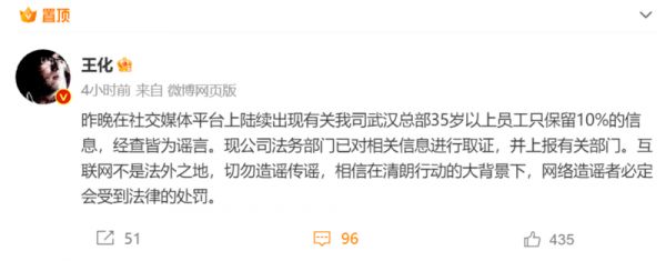 5月14日下午,小米集团公关部总经理王化在其个人微博发文回应了上述事件:“昨晚在社交媒体平台上陆续出现有关我司武汉总部35岁以上员工只保留10%的信息,经查皆为谣言。现公司法务部门已对相关信息进行取证,并上报有关部门。”
