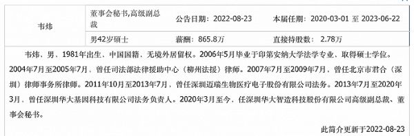 资料显示,韦炜1981年生,2006年5月毕业于印第安纳大学法学专业,取得硕士学位。2004年7月至2005年7月,曾任司法部法律援助中心(柳州法援)律师。2007年7月至2009年7月,曾任北京市君合(深圳)律师事务所律师。2011年10月至2013年7月,曾任深圳迈瑞生物医疗电子股份有限公司法务。2013年7月至2020年3月,曾任深圳华大基因科技有限公司法务负责人。