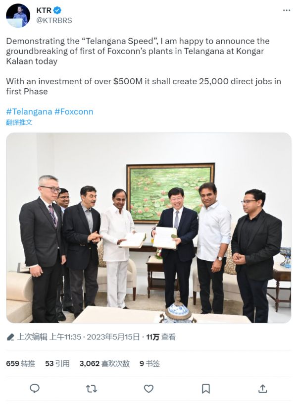 IT之家 5 月 15 日消息,苹果供应商富士康在在印度南部 Telangana 邦的第一家工厂今日破土动工。该邦的 IT 部长周一透露,富士康将在该地投资 5 亿美元(IT之家备注:当前约 34.8 亿元人民币),将直接创造 25,000 个工作岗位。