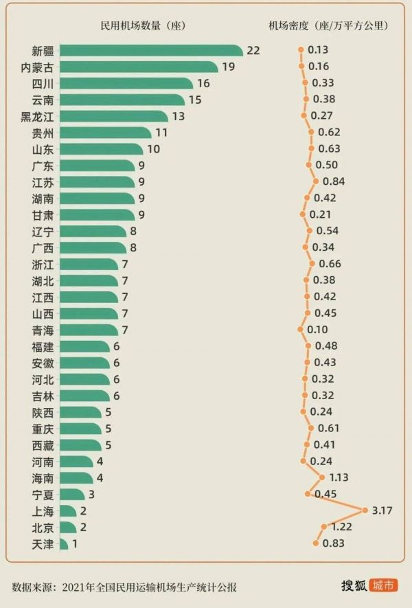 新疆以22个机场位居全国之首,作为面积最大、地域最为广阔、地形最为复杂多元的省份,在新疆“市市通机场”,远比“市市通高铁”更有性价比。