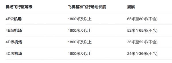 如果以飞行等级来看,根据跑道长度、飞机翼展和轮距的不同,可将机场分为4F、4E、4D、4C、3C、3B、2C、2B等等,4F最高,依次向下。