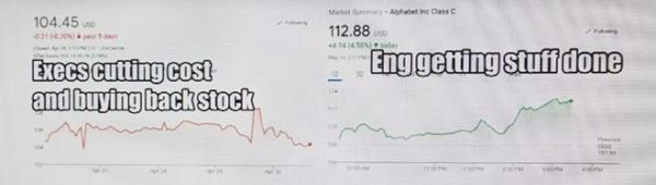 在谷歌的内部网站Memegen上,一张以母公司Alphabet的股价对比图的表情包最受欢迎,获得了几千个“赞”。图片左侧是公司股价下跌的图表,上面写着“高管们削减成本并回购股票”。右侧则是公司股价上涨的图表,上面写着:“工程师们完成了工作。”