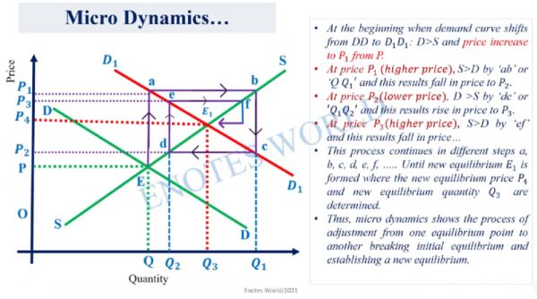 但此次价格下跌的幅度已经小于前次价格上涨的幅度,后续的供给量变化同理,经过若干次逐渐收敛的反复拉扯,最终到达新的供需平衡点E1。