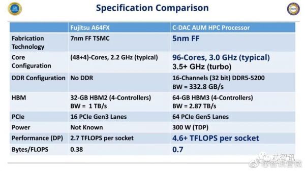 C-DAC还将AUM与富士通的A64FX处理器进行了对比,可以看到,AUM不仅支持更先进,核心数量核主频更高,HBM内存容量翻倍,支持高达64路的PCIe Gen5接口,整体的性能达到了A64FAX的近2倍,TDP为320W。
