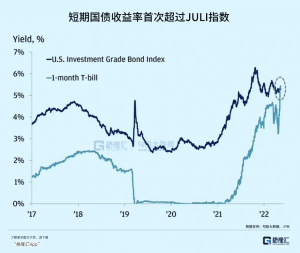 1年期美债CDS已经从年初的25个基点飙升至近日的172个基点,创下历史新高。另外,最新1月期美债收益率为5.652%,而5月4日为4.43%。该收益率水平已经追上投资级债券收益率了。