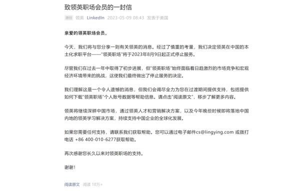 2023年5月9日,领英宣布本土化求职平台领英职场将在8月9日停止服务。据了解,领英职场于去年12月14日上线,上线不到半年就将下线,比领英之前推出的赤兔更“短命”,而这背后是领英本土化策略的又一失利。