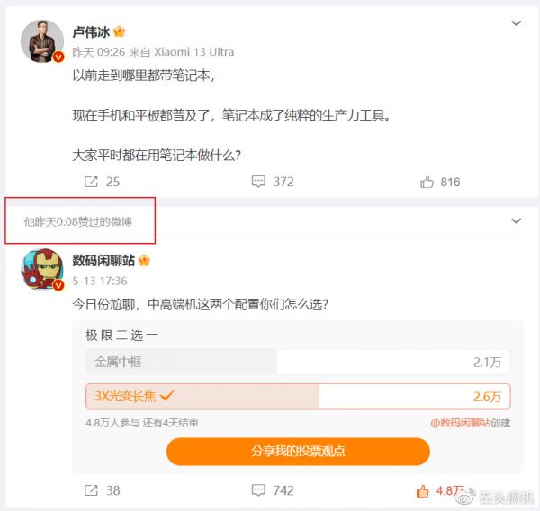 不仅仅是Redmi Note 12 Turbo,还有很多两千档手机去掉了屏幕塑料支架,那么何时两千档用金属中框呢?近期,有网友针对中高端价位段进行了调研,金属中框和3X光变长焦二选一?有意思的是,卢伟冰在深夜也参与了调研,但不知道他给的选项。以此来看,未来的Redmi手机可能要上金属中框或3X光变长焦。