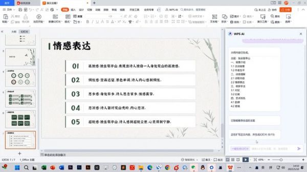 WPS AI现已支持输入主题一键生成PPT演示文稿,并且还可以提供进一步细化调节的功能。例如更改主题风格、单页美化、更改字体、更改配色、生成演讲稿等等,解决了演示文稿制作难度大、耗时长的办公难题。