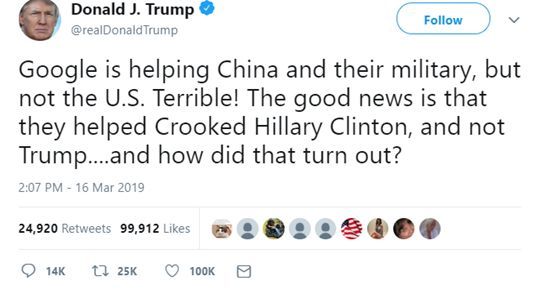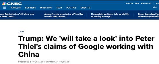 原来,虽然特朗普在几小时前表示,他将调查彼得·蒂尔这位“伟大和聪明”的人对谷歌做出的“给中国政府卖命”和“叛国”的指控,美国媒体也陆续报道了特朗普的这一表态——可早在今年3月的时候,特朗普就已经发帖抨击过谷歌“帮中国”的“可怕行为”了。