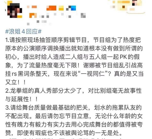 对于《浪姐》这样同时注重舞台和真人秀的节目来说,这两者的呈现几乎缺一不可。第二期播出当天,《龙拳》组就被诟病真人秀部分太过单薄。