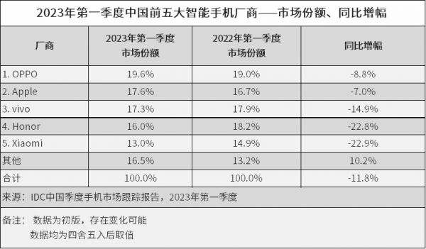 2023 Q1的手机销量数据,各大调研机构已经陆续公布。IDC报告显示,中国智能手机市场出货量6544万台,同比下降11.8%;OPPO以1282万台出货量位列第一,拿下19.6%份额。OPPO Q1出货量同比下滑8.8%,但比安卓阵营的竞争对手好不少。TOP5厂商中,苹果跌幅最小,只有7.0%,并没有领先OPPO太多。