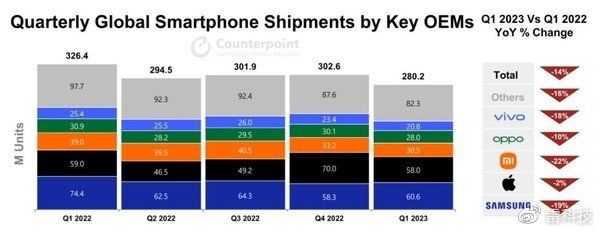 关于全球手机市场,Counterpoint率先公布了Q1的数据,TOP5厂商分别为三星、苹果、小米、OPPO和vivo,总出货量2.8亿台,同比下滑14%。OPPO Q1全球出货2800万台,同比下降10%,同样是苹果之外跌幅最小的。