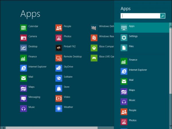 Search Charm 可以帮助用户搜索应用、文件或者某项设置。在 Win8 系统中,用户打开 Search Charm 时,会全屏显示搜索界面。微软在 Win8.1 系统中改为搜索面板,靠近屏幕右侧。