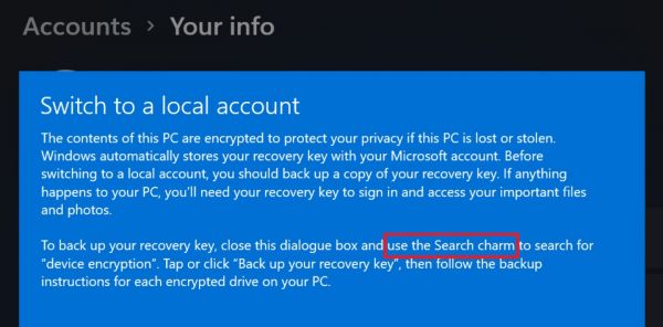 报道称在 Win11 系统中,在设备启用加密功能的状态下,当用户尝试从微软账号切换到本地账号时候 ,将系统提示中依然引用了 Win8 系统中“Search Charm”。