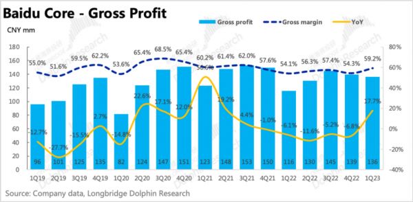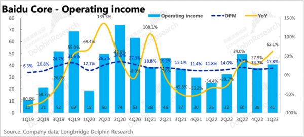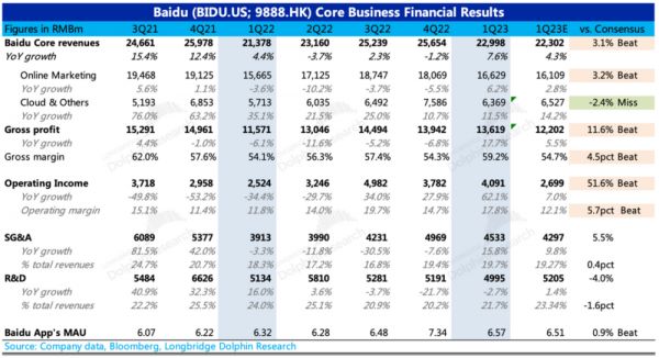 北京时间5月16日港股盘后,百度(9888.HK;BIDU.O)发布了2023年一季度财报。剔除爱奇艺只看百度核心业务的情况:
