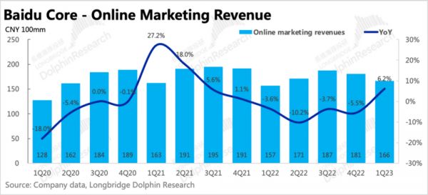 上季度电话会中,鉴于当时消费复苏的慢节奏,管理层给的指引比较保守(保证正增长),刻意降低市场对百度广告的预期,在财报发布之前,市场对核心广告收入增速的一致预期为2.8%yoy。海豚君也注意到一些头部投行的预期也在1~2%yoy徘徊。