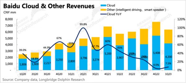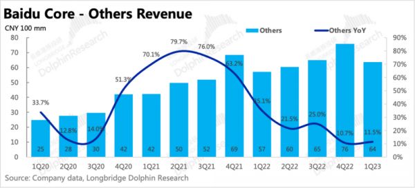 一季度虽然管控放开,但智慧云等创新业务并没有增长加速,不及市场预期。Q1百度核心其他收入约在64亿,同比增长11.5%,与去年四季度增速持平,并没有因为防疫政策调整,商业交付有所恢复而获益。海豚君认为,一季度云业务表现,可能与自身还处于项目整合调整期有关——主动剥离低效益的合作项目。