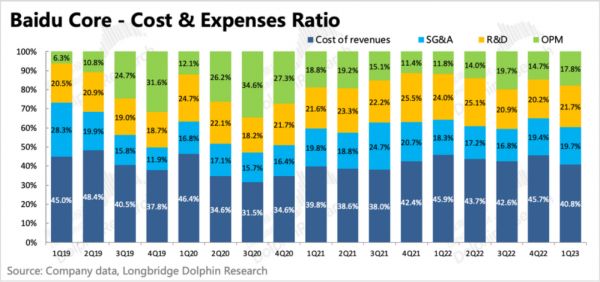 除此之外,其他收入的增长未加速与成本、研发费用的同比下滑放在一起来看,海豚君认为备受关注的文心一言,虽然自3月中旬发布,但一季度可能还未有多少收入确认。因此AI投入对利润率的影响可能会在下季度看到。