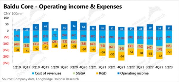 一季度销售费用已经恢复到16%的正增长,虽然研发费用还在同比小幅下滑,但考虑到下季度会有AI相关费用计入,因此百度在费用上做的经营提效,在持续一年后,已经进入尾声。