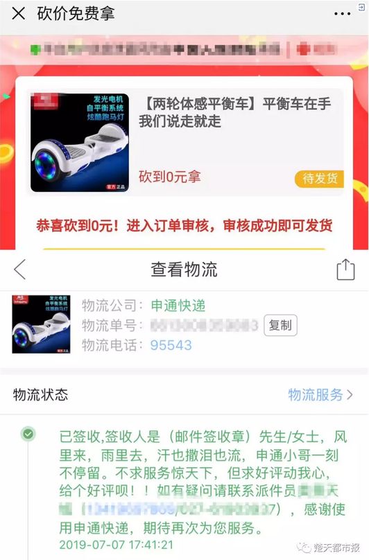 市民韩女士通过砍价免费拿的平衡车