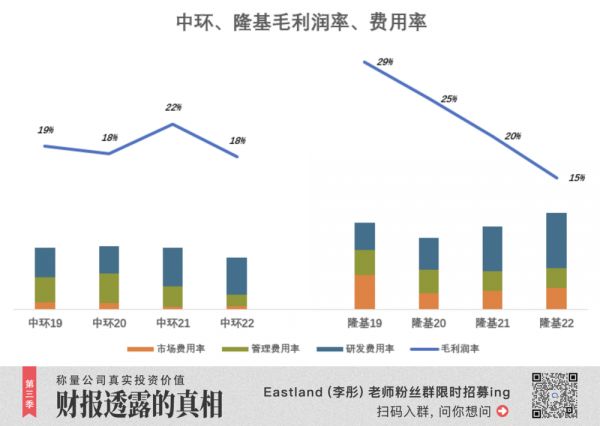 先看毛利润率,隆基毛利润率持续下滑,2022年竟比2019年低14个百分点!中环毛利润率保持在18%一线,2022年比隆基高2个百分点。