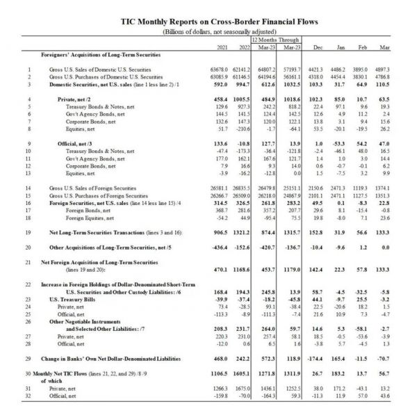 考虑到外国和美国证券的交易,调整后的3月份美国长期证券的总体海外净流入约为1333亿美元。