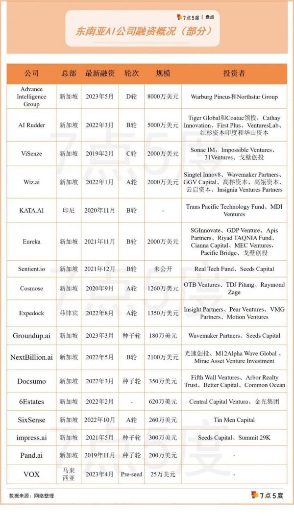 从投资者画像来看,一些知名VC和投资集团也活跃在东南亚AI创投圈中,比如Warburg Pincus、Northstar Group、Tiger Global、GGV Capital、高榕资本、高瓴资本、光速创投等。这表明,东南亚AI公司也在不断吸引投资者的注意。