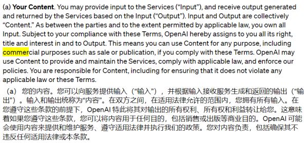 相比之下,OpenAI则体现了对客户的一种温情:它明确将用户生成的内容的所有权利、所有权和利益转让给客户。