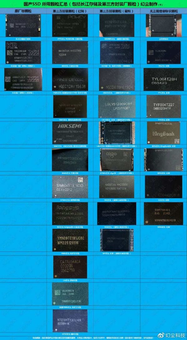 我简单做了一个国产SSD所用颗粒汇总图,已经更新至第四版本了。其中原厂颗粒,第三方已知颗粒,都可以放心大胆的买。其它的,就看价格了,如果价格超便宜,也是可以买的,但要做好售后的心理准备,牢记一分钱一分货。厂家都不嫌弃你穷,你却要嫌弃人家用未知颗粒,用黑片?这个是说不通的。如果你真的在意颗粒,那就加钱上致态(致钛)吧,这个总没错。