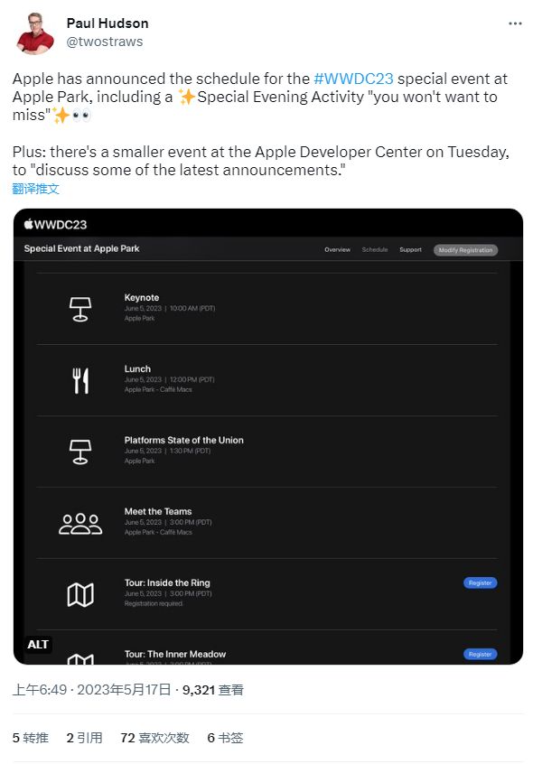 IT之家 5 月 17 日消息,有幸参加苹果 WWDC 2023 开发者大会的用户已陆续收到活动日程安排表,开发者 Paul Hudson 发布推文,分享了部分日程安排。